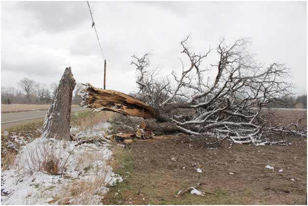 The next day on April 13, a storm that produced shear winds went through the area. Many large, older evergreens can be seen on their sides.