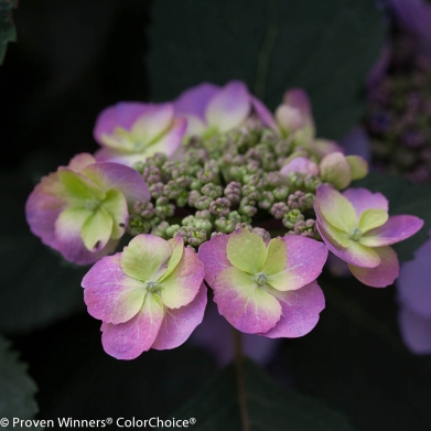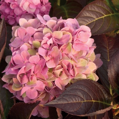 Tuff Stuff (A Proven Winners ColorChoice Plant) – A reblooming plant with reddish-pink lacecap flowers in early summer until frost. (2-3′ tall and wide)